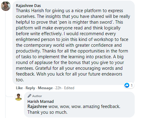 Since Sept 2020, over 350 writing enthusiasts and experts have joined contests and workshops to gain clarity, confidence and competence as a writer. Below are some testimonials from some of our power writers.